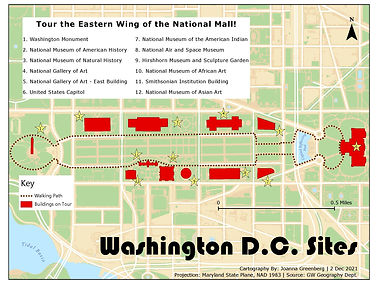 This required me to make vector polygons traced over satellite imagery for each of the landmarks. Additionally, I drew the walking path. The map is meant to be appropriate for tourist use, thus the less formal design.